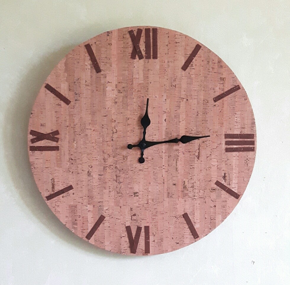 Pendule recouverte de liège. Chiffres également en liège teinté couleur chocolat.