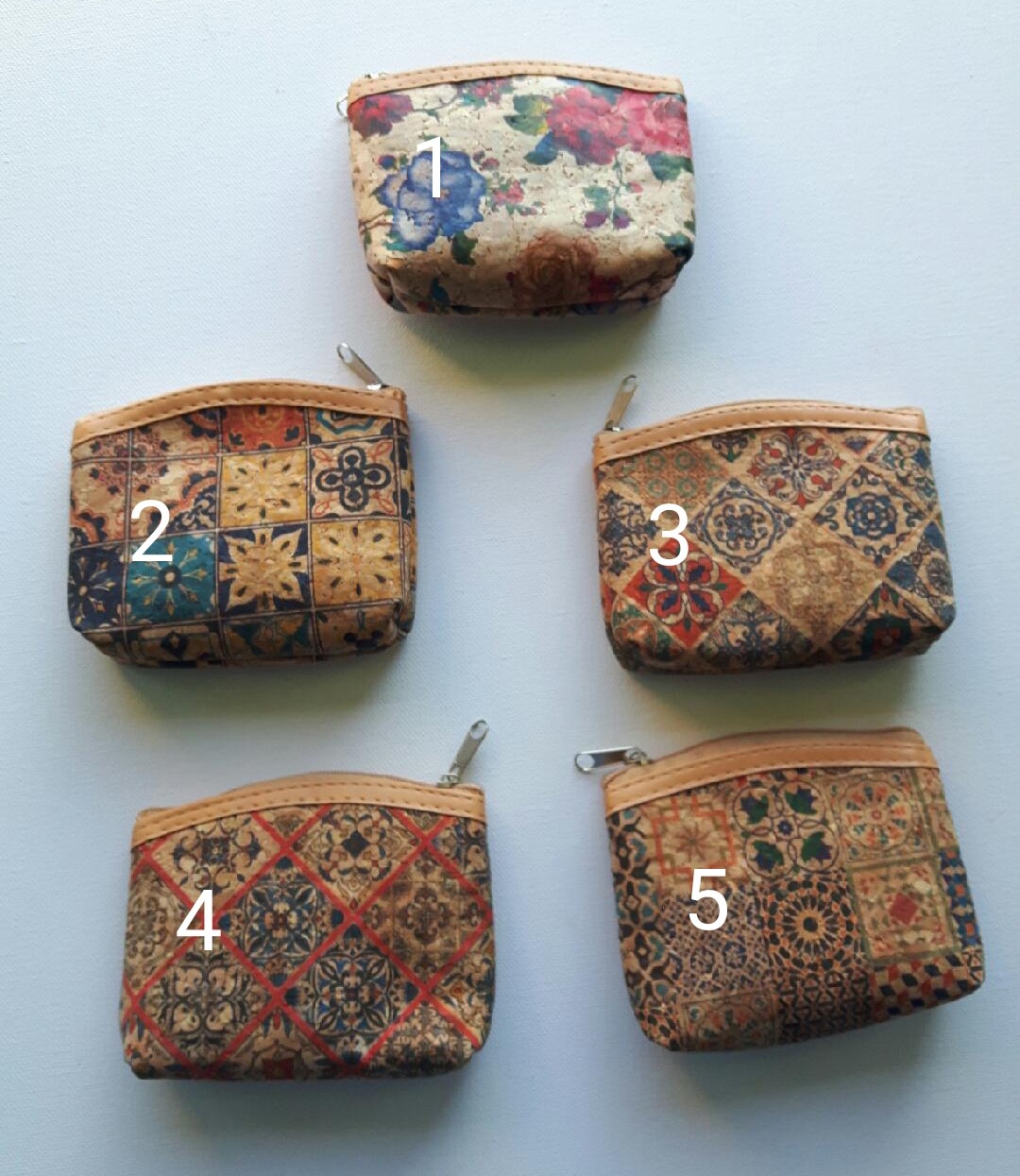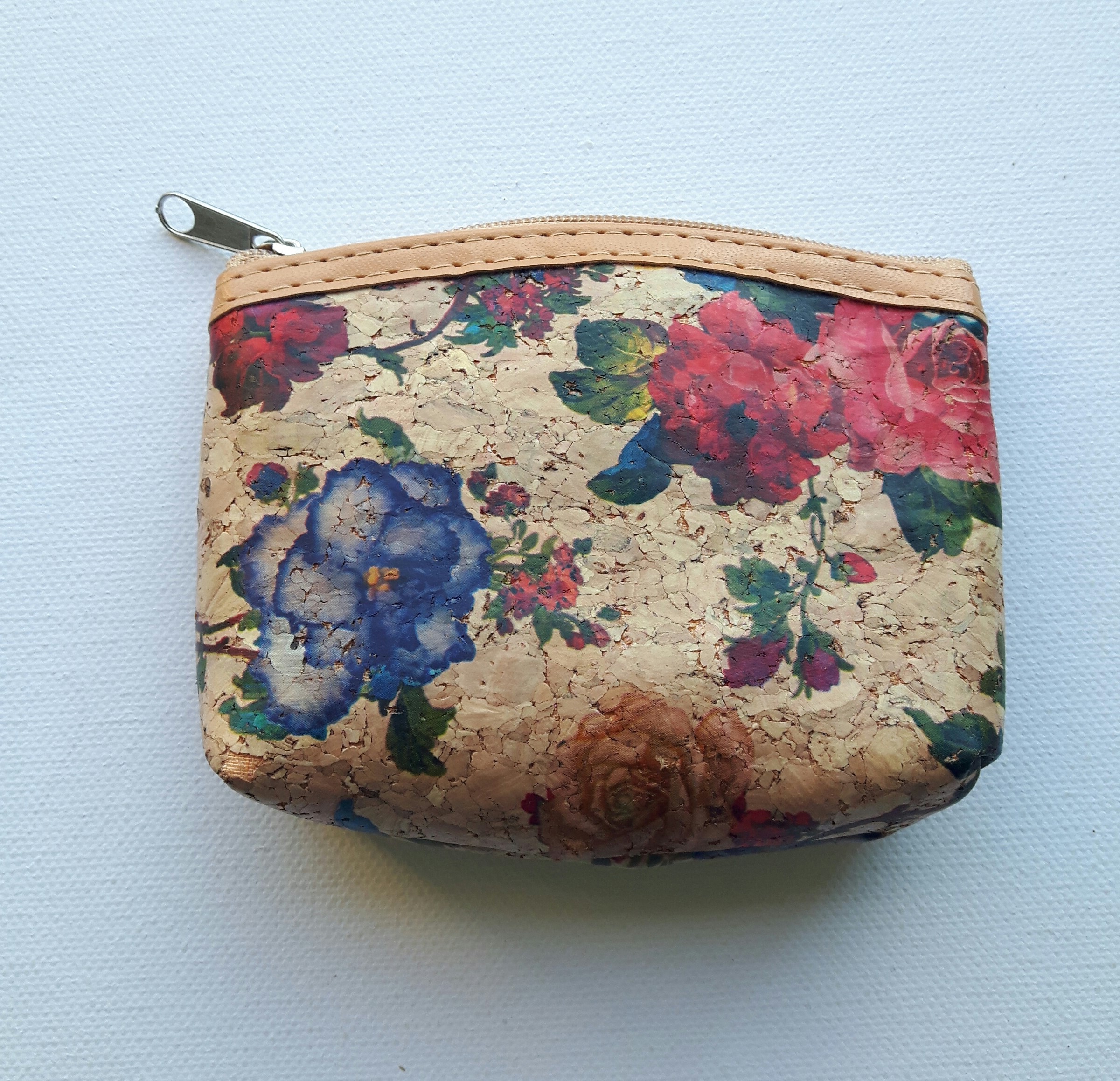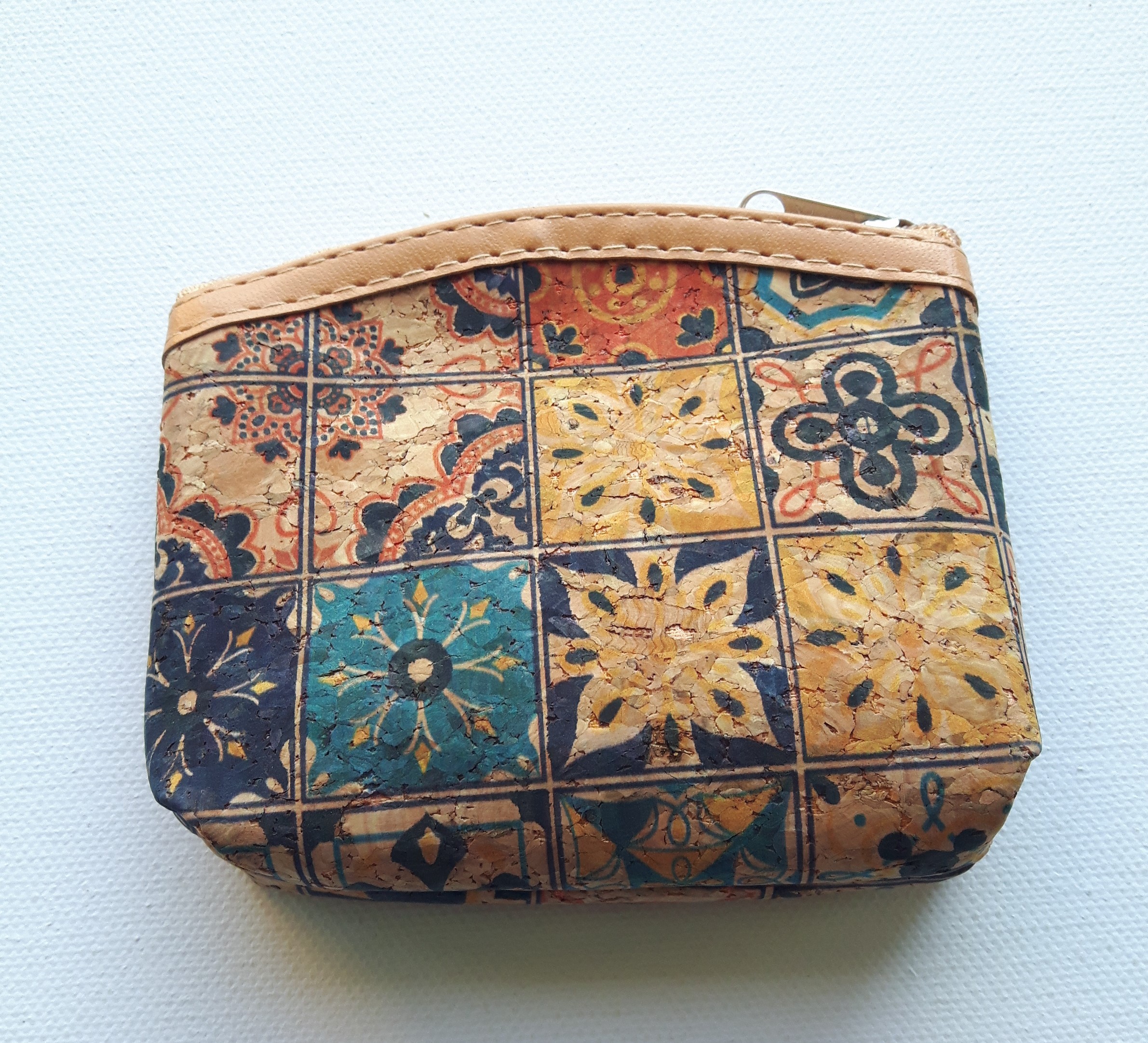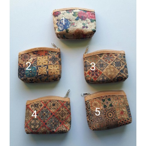 Porte monnaie en liège imprimé avec le rebord en haut en simili cuir.
