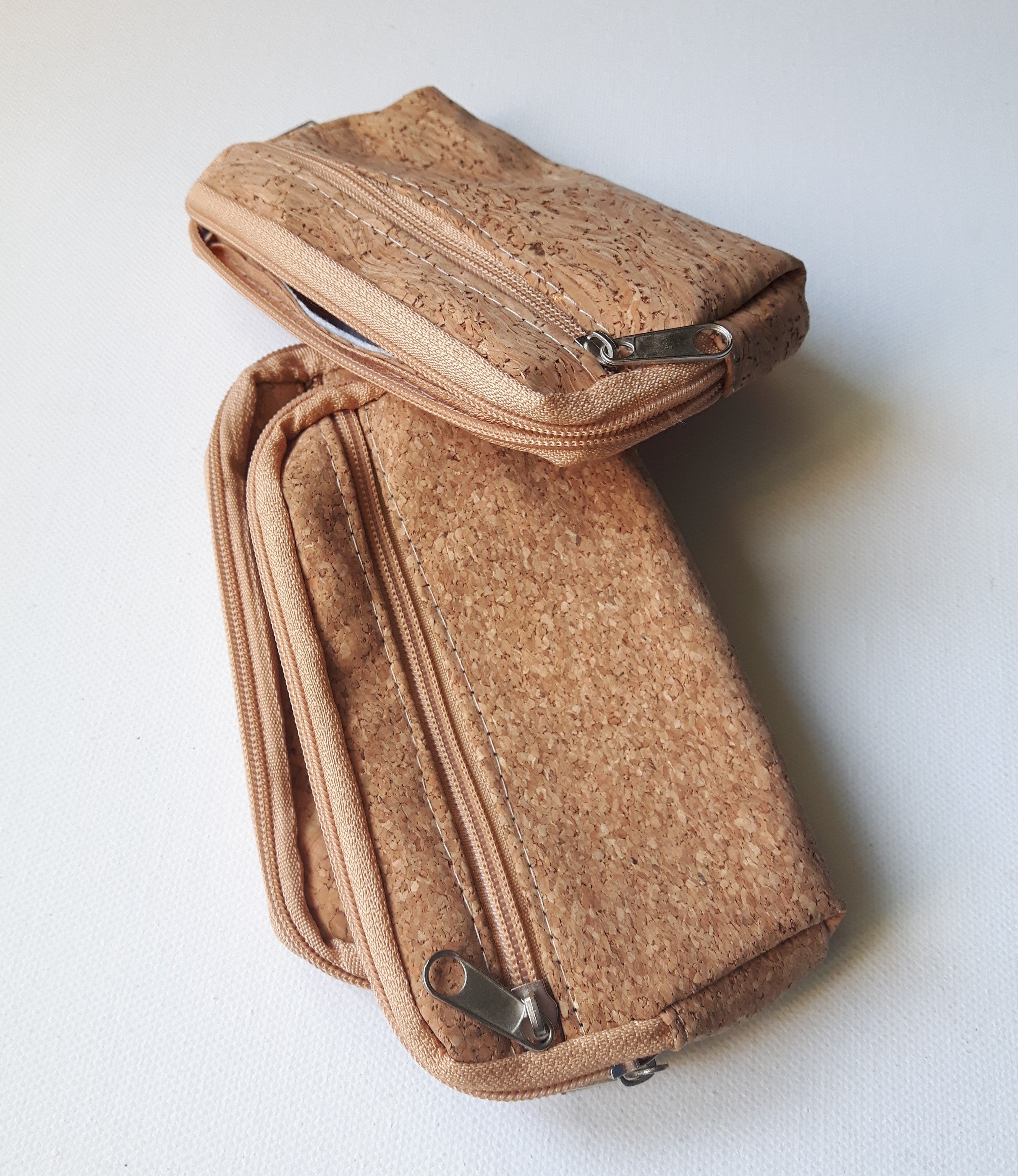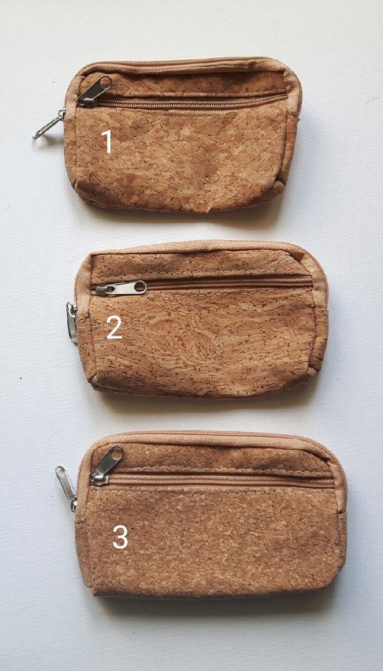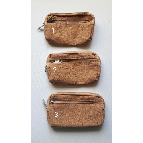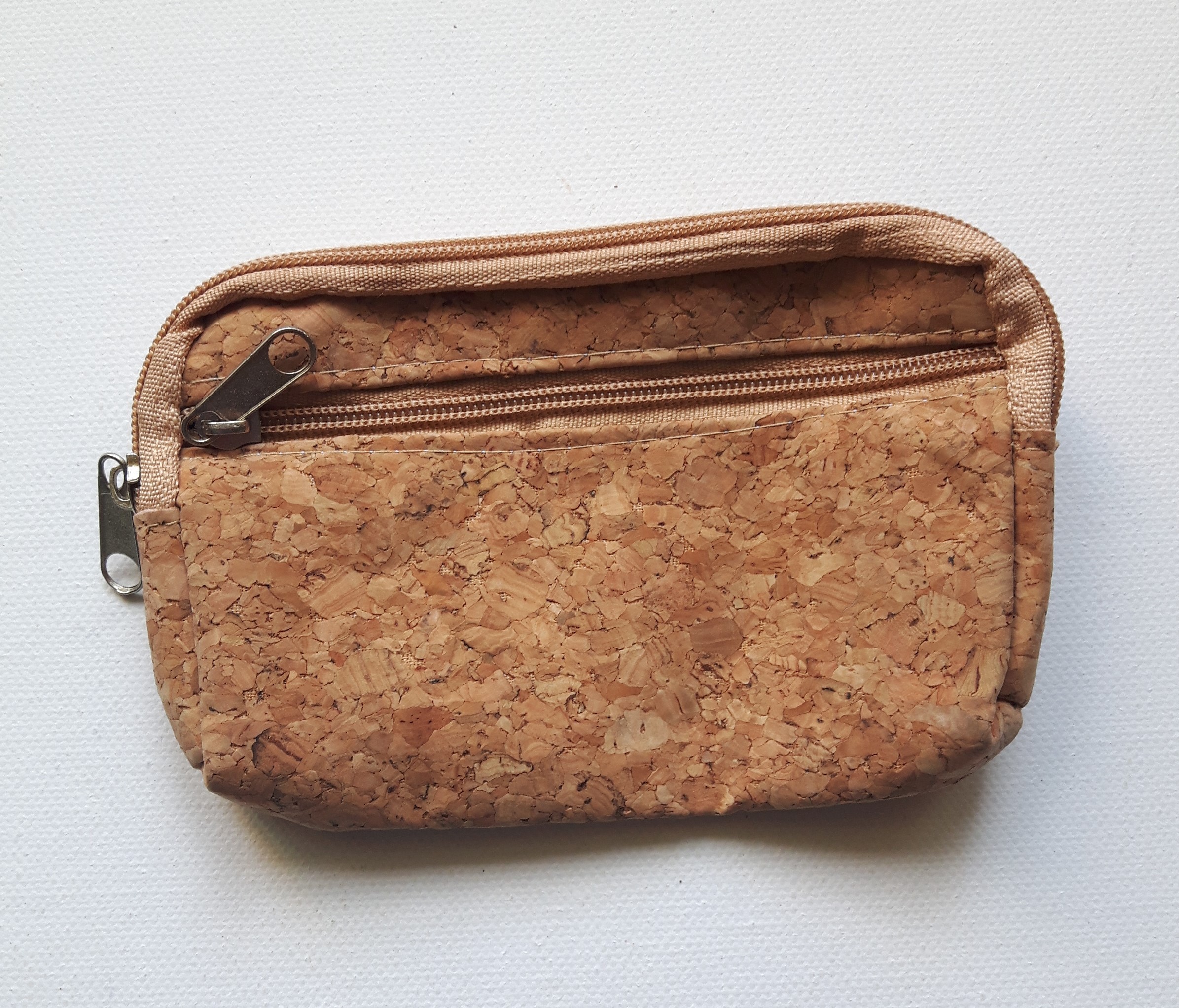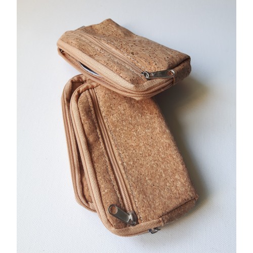 Porte monnaie en liège naturel avec 2 fermetures. La fermeture du haut s'ouvre jusqu'au milieu des 2 cotés.