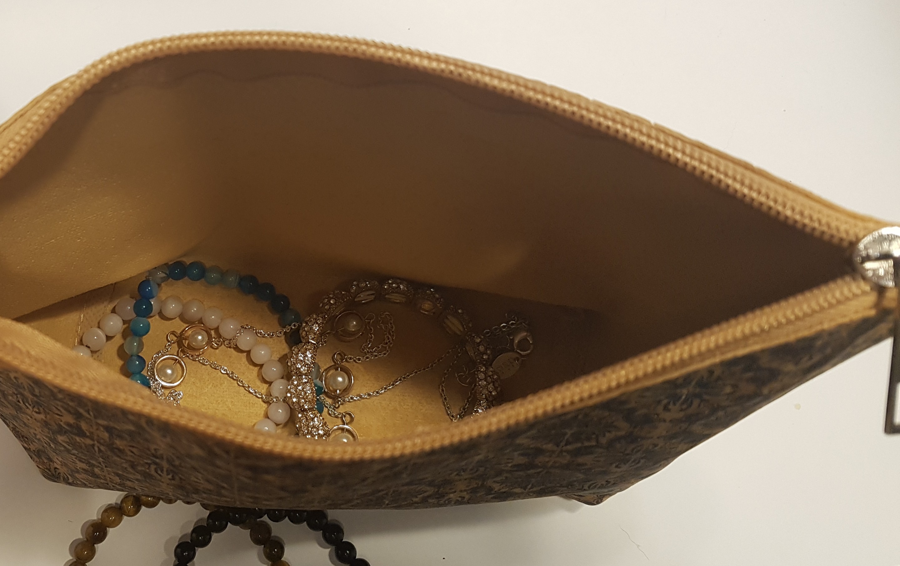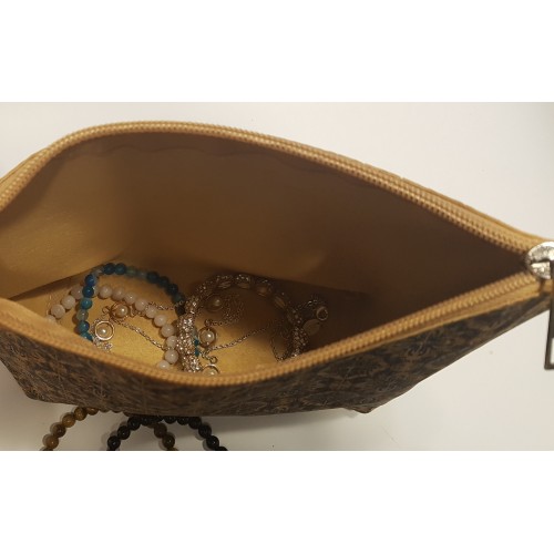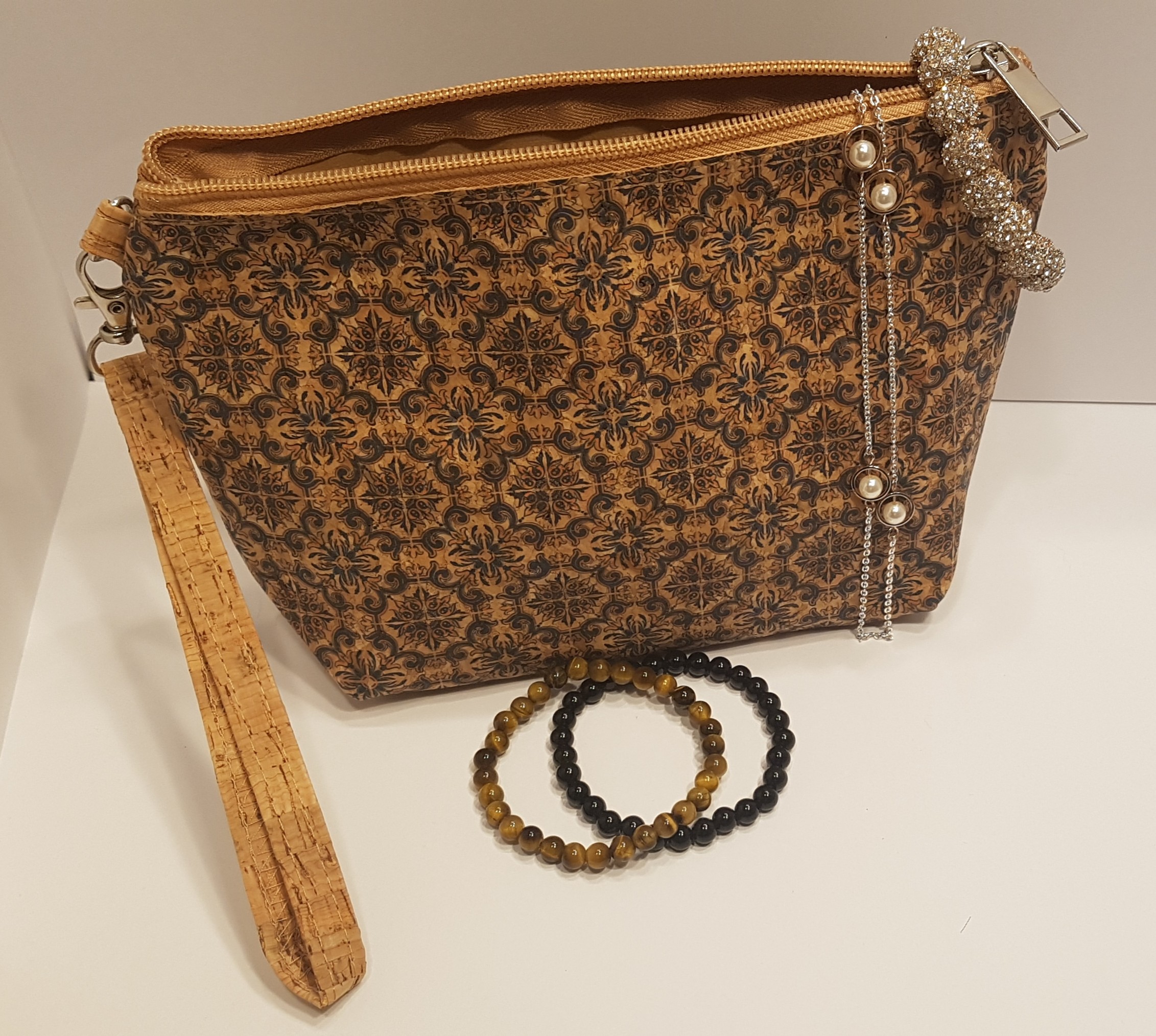 Pochette ou trousse en liège imprimé avec petite lanière pour poignet