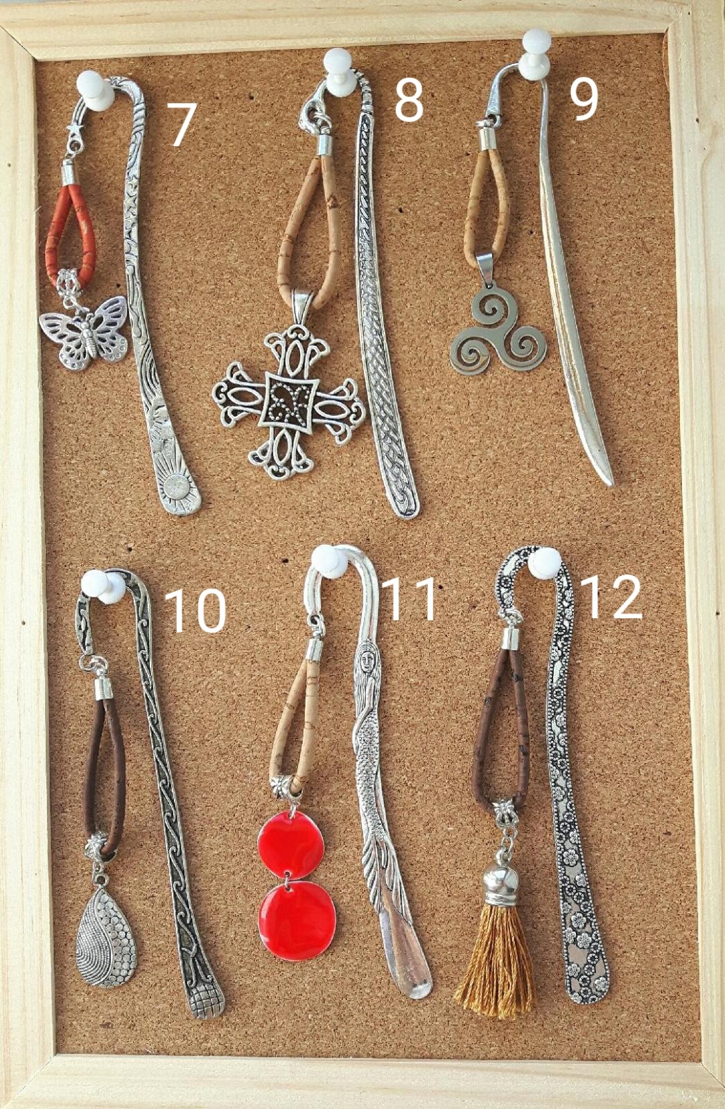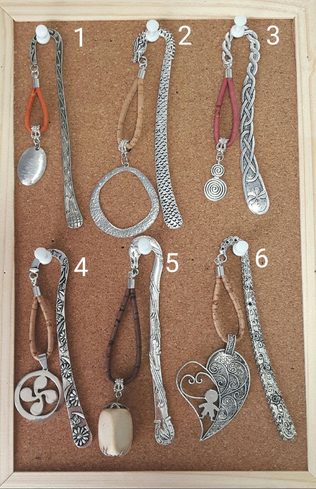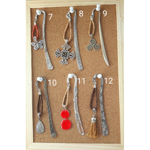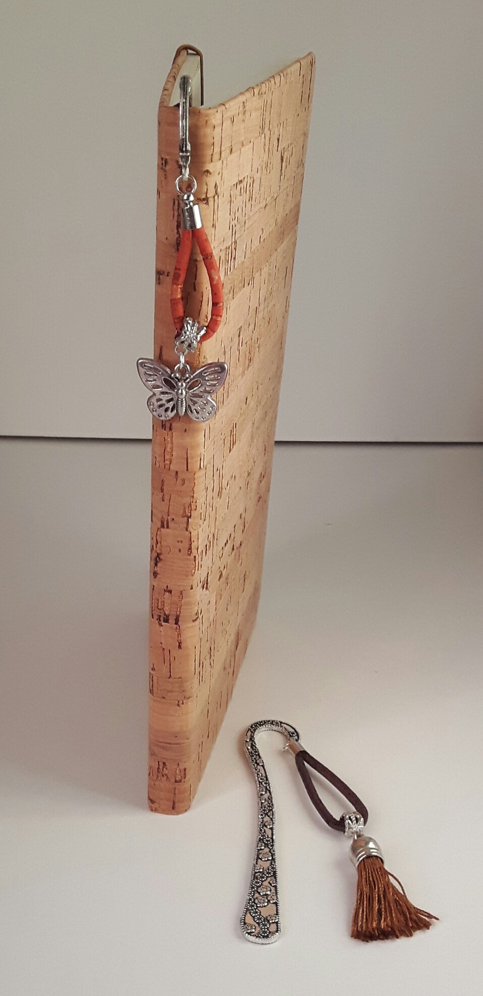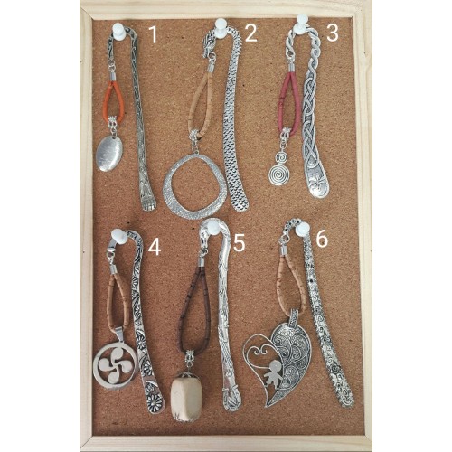 Marques pages en métal argenté et pendantif avec du liège naturel ou du liège teinté.